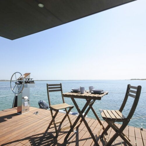 The Houseboat ‘Casa da Ria’ is a self-sustaining and ecological boat, as it has the capacity to generate energy for all its equipment. With a modernist design, rationality of space, comfort, utility and good ventilation and lighting were prioritised, giving this boat a unique character. It is equipped for 4 people and is divided into two floors. The first floor contains the bedroom with 1 double bed and panoramic views from the balcony. The kitchen has a dining table and is equipped with crockery, a small cooker, fridge (with freezer drawer), coffee machine and microwave. The shower, washbasin and WC area are also on this floor. The dining table in the kitchen can be converted into a sofa bed with sleeping capacity for 2 people. The 2nd floor is characterised by a privileged view of the Ria Formosa, with a shaded solarium and sun loungers. The boat also has access ladders at the stern and a small semi-rigid rowing boat for travelling to the deserted beaches around 50 metres from the boat.