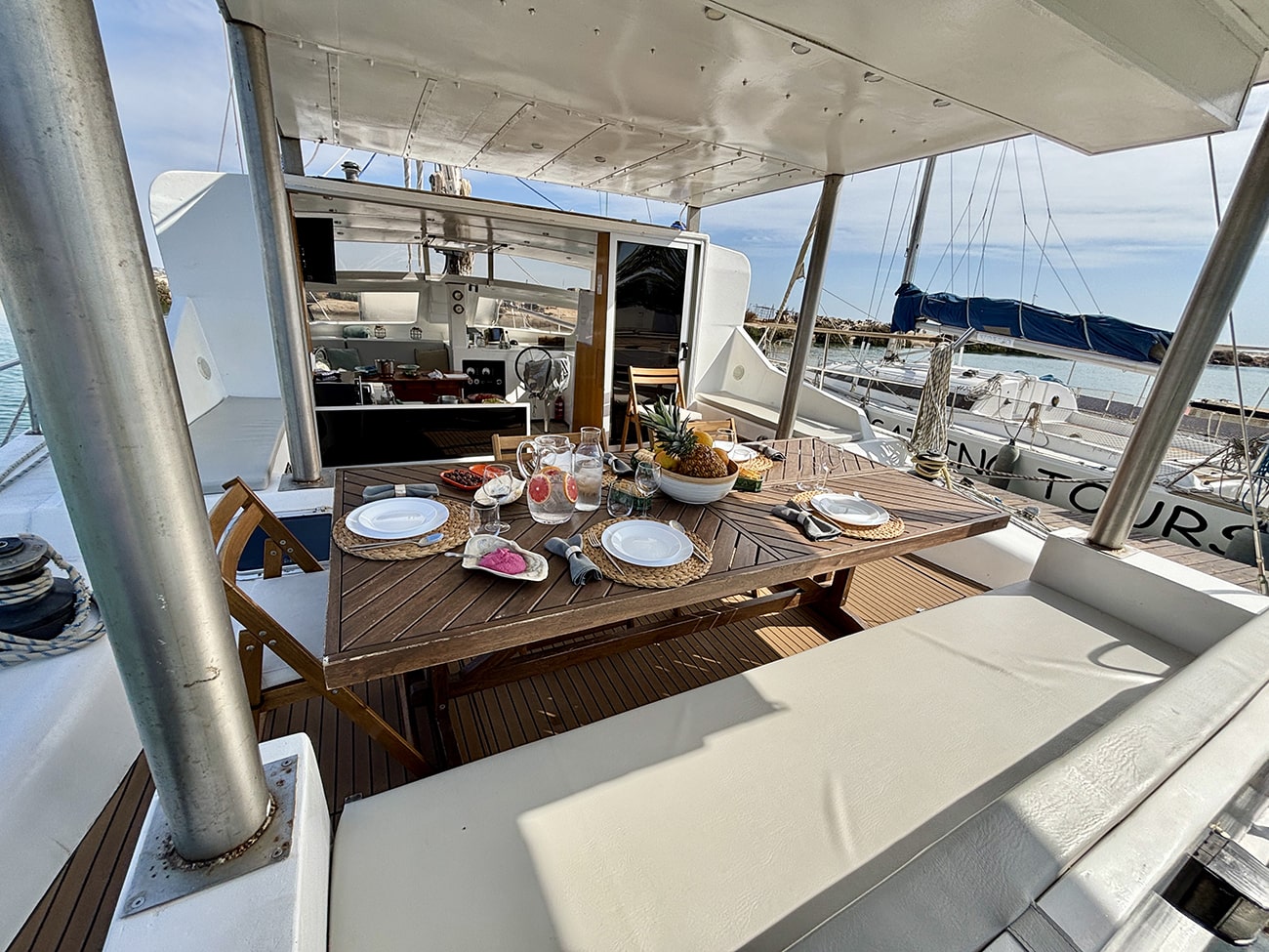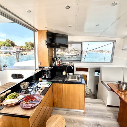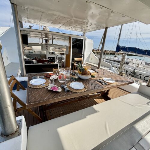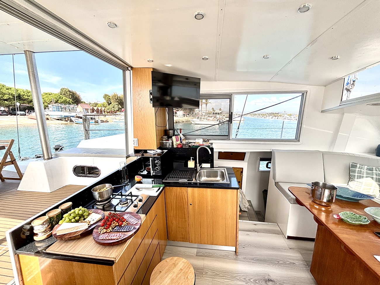 Este barco-casa é um catamarã à vela ecológico, com capacidade para até 8 pessoas. Dispõe de quatro suítes, duas a bombordo e duas a estibordo, todas com cama de casal e casa de banho privativa com duche. Os hóspedes têm à disposição uma cozinha equipada, com fogão, micro-ondas e frigorífico, ideal para preparar refeições de forma prática e confortável. O barco conta ainda com uma área de estar e jantar interior, bem como uma zona exterior de refeições.