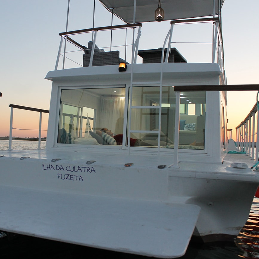 O Barco Casa fica ancorado junto à praia da Barra Velha.